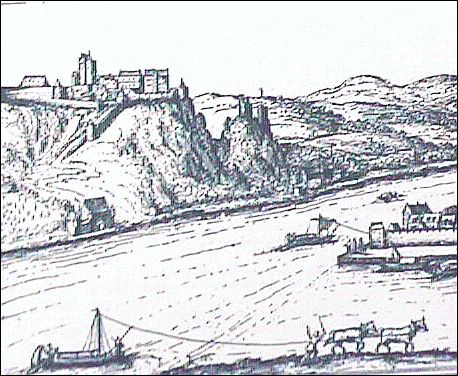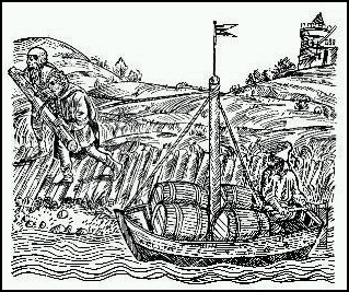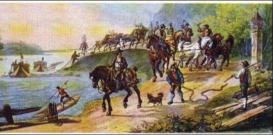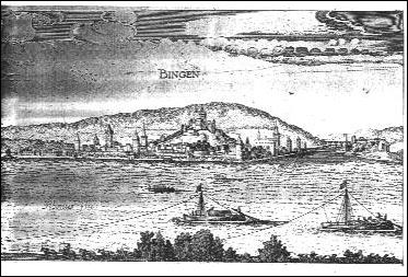 Treideln großer Schiffe mit Pferdegespannen bei Bingen. Die Schleppleinen sind oben am Mast befestigt, ein kurzes Seil läuft von der Schleppleine zum Bug des Schiffes, um auch diesen in Schlepprichtung zu bringen. Kupferstich von Matthäus Merian , um 1645