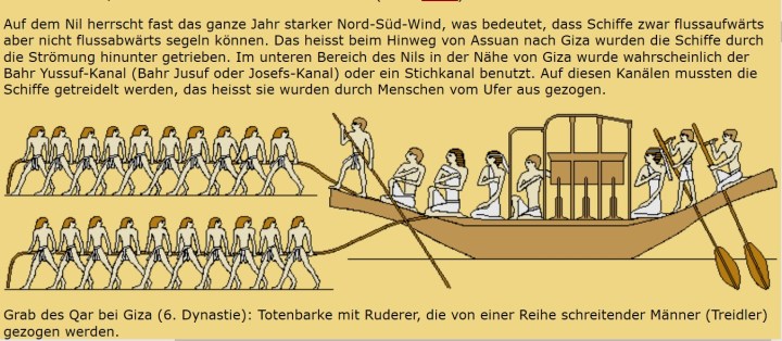 Auf der Webseite von Franz Löhner über den Bau der Cheops-Pyramide findet sich diese rekonstruierte Grafik, die laut Franz Löhner aus dem Grab des Qar bei Giza (6. Dynastie) stammt: Totenbarke mit Ruderer, die von einer Reihe schreitender Männer (Treidler) gezogen werden.
