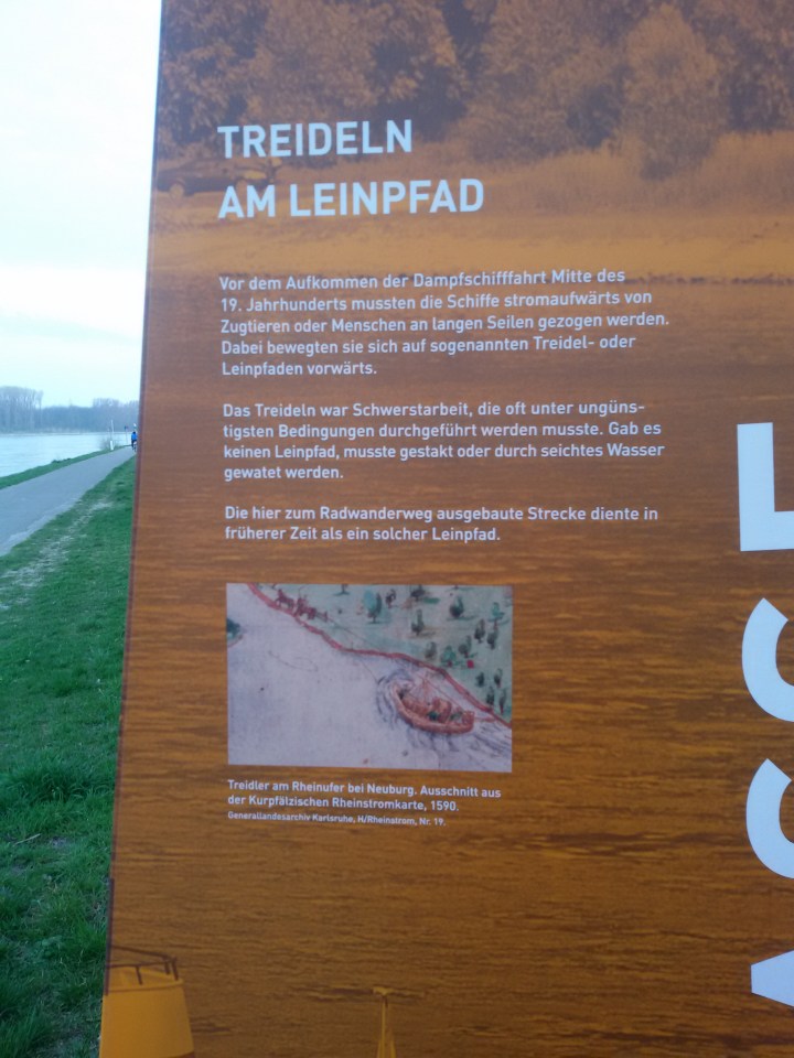 Unsere Kreisstadt Germersheim/Rhein hat den ehemaligen Treidelpfad entlang des Rheins zu einer kleinen Promenade ausgebaut. Auf Info-Tafeln antlang des Weges wird unter anderem auch über das frühere Treideln entlang des Rheins informiert. Hier finden Sie Fotos der Info-Tafel über das Treideln.